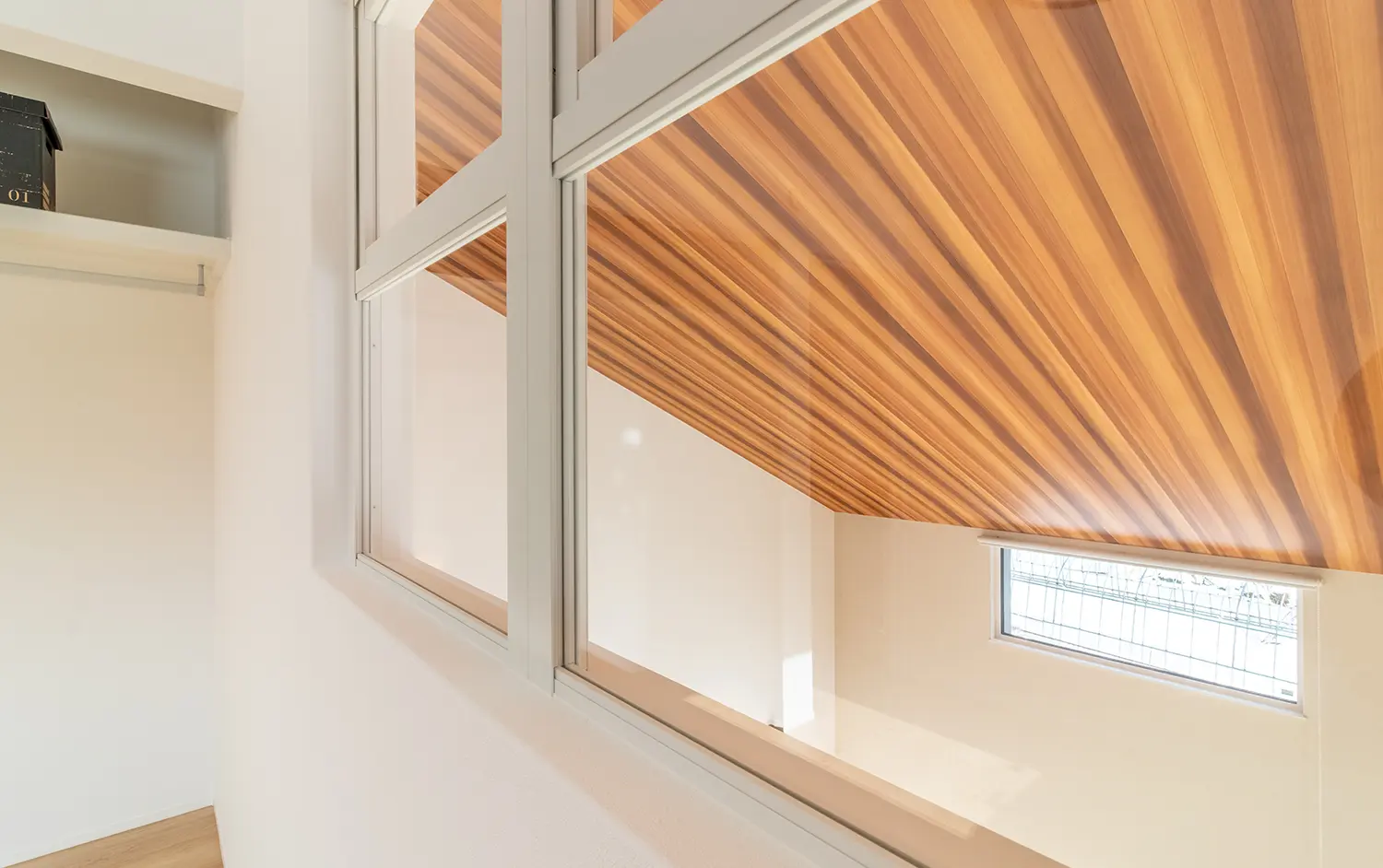 2階子ども部屋の室内窓も、より広さを感じるポイント。ぜひ見学会で、窓越しに見る勾配天井の迫力を感じてください!