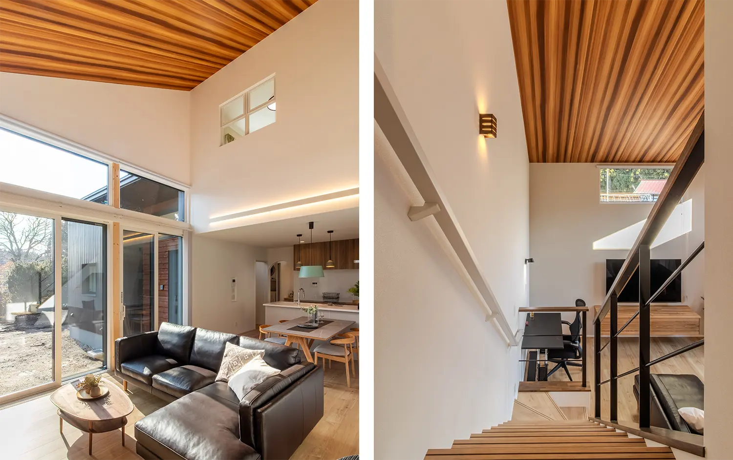 2階の天井まで駆けのぼっていく斜面のように見える、勾配天井の吹抜。ダイニングの天井までは低く落ち着いた雰囲気にして、リビングからは一気に解放感が増します。