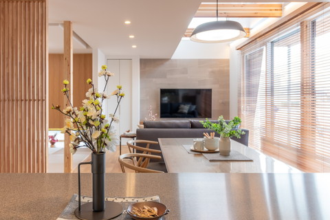 このおうちには木製のブラインドや、和室をスマートに仕切るロールスクリーンなど、「動かせる・遮る」機能。