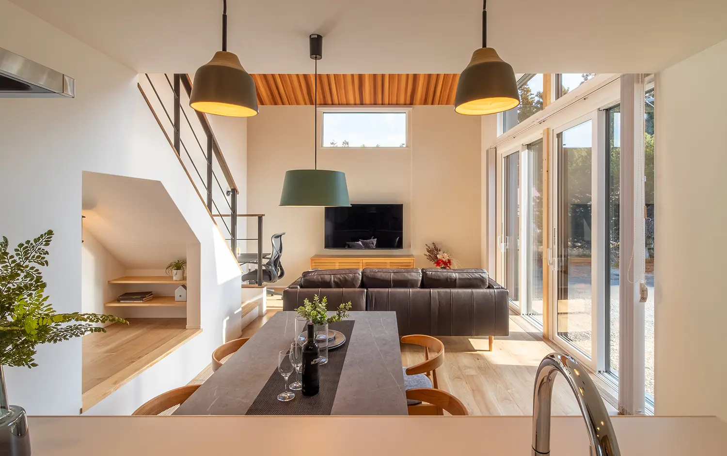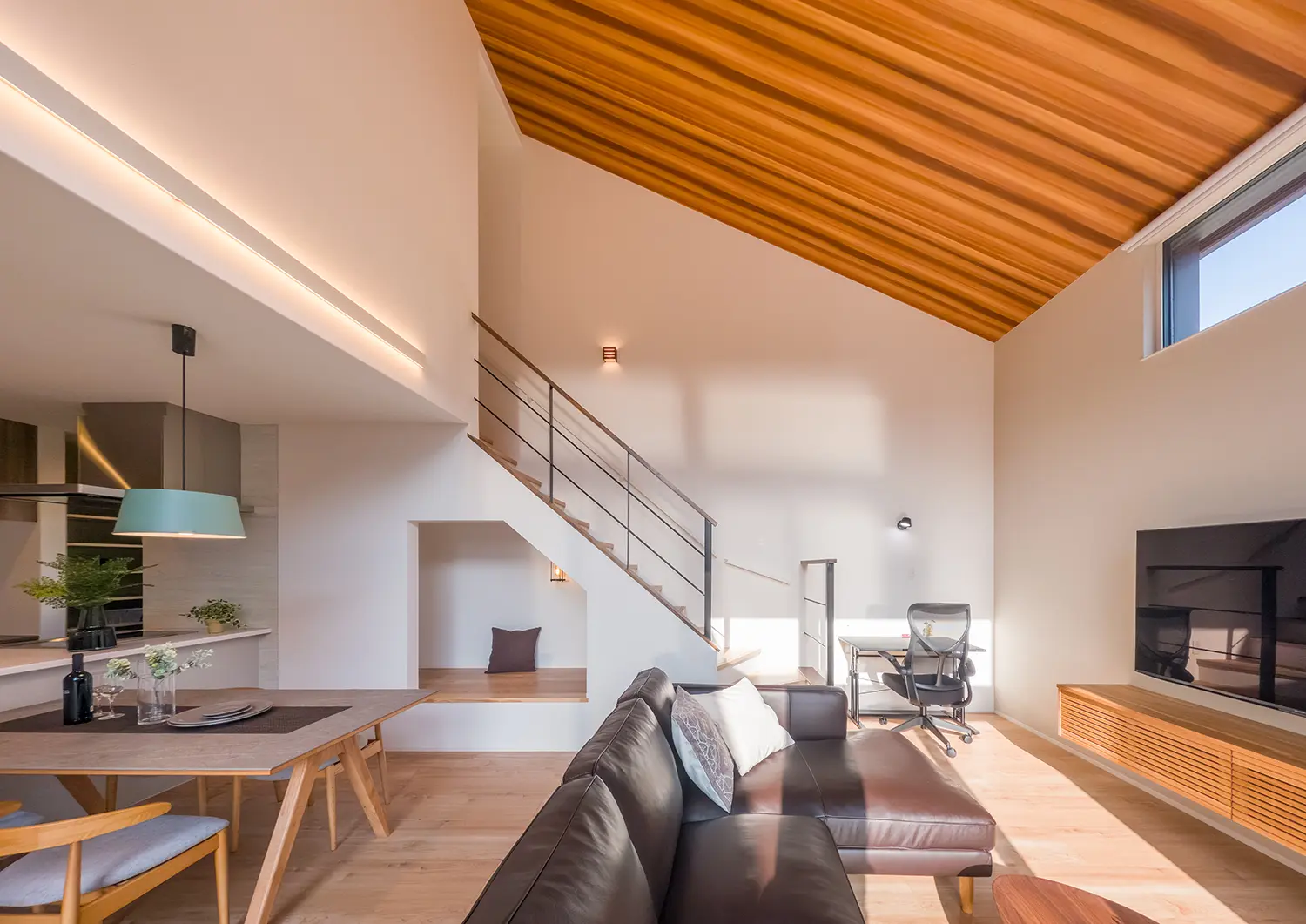 2階の天井まで駆けのぼっていく斜面のように見える、勾配天井の吹抜。ダイニングの天井までは低く落ち着いた雰囲気にして、リビングからは一気に解放感が増します。