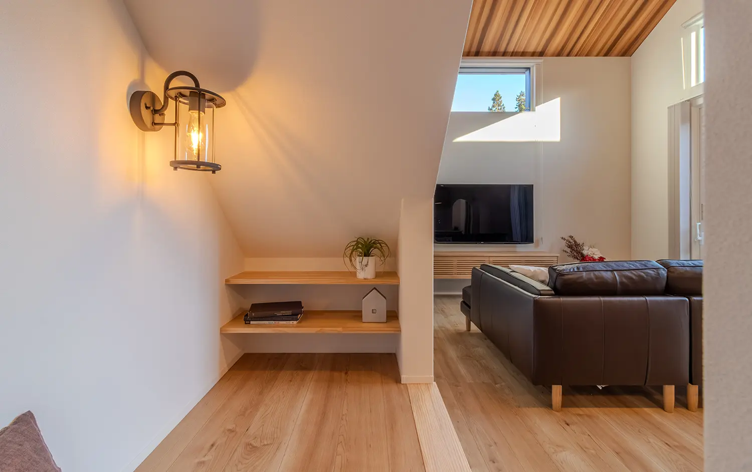 インテリアは木目調の勾配天井とダーク系の家具でメリハリのついた、かっこいい北欧系にしています。