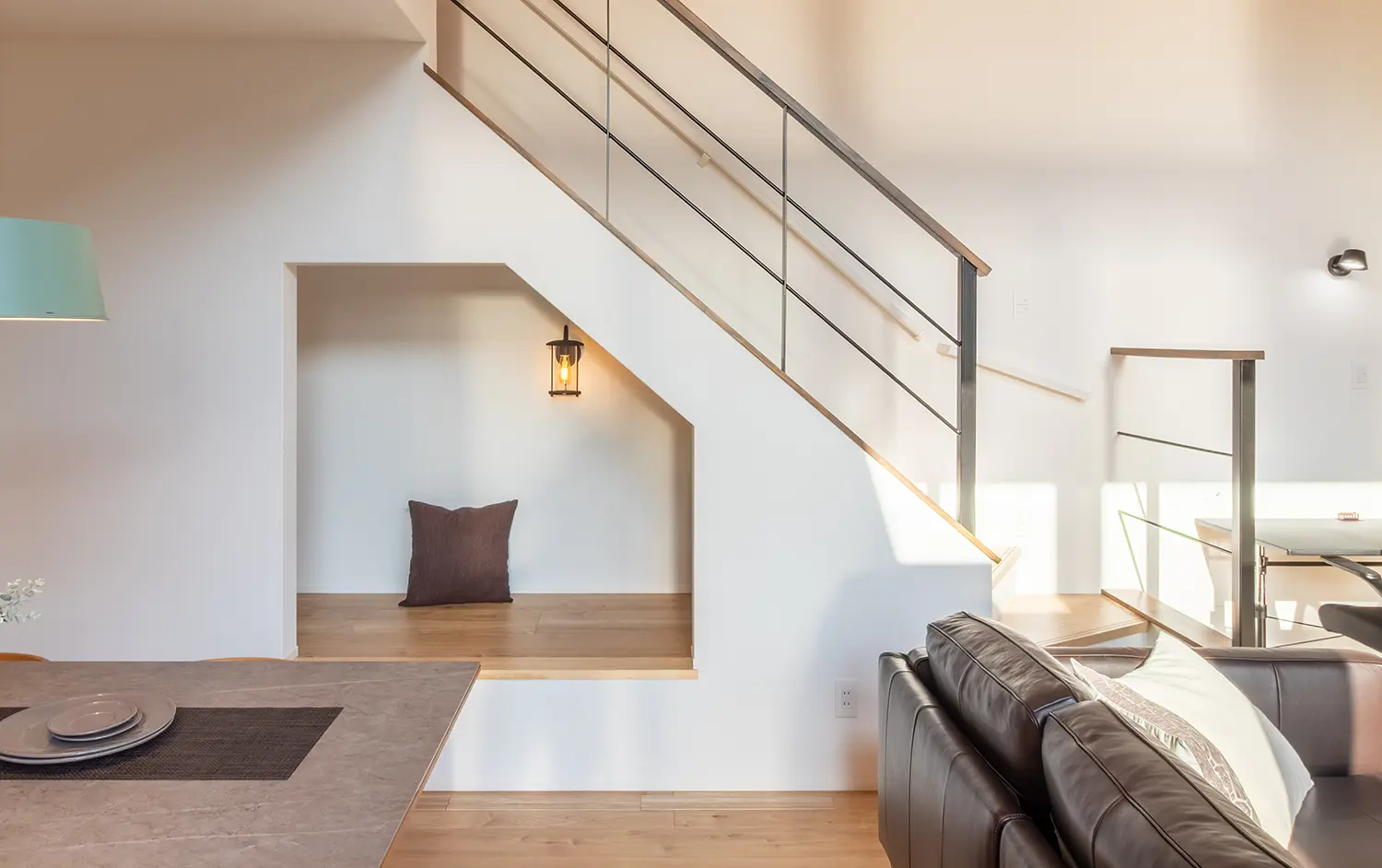 「ヌック」と呼ばれる階段下の小さなおこもり空間。そして階段横の空きは、PCデスクを置くためのスペースです。