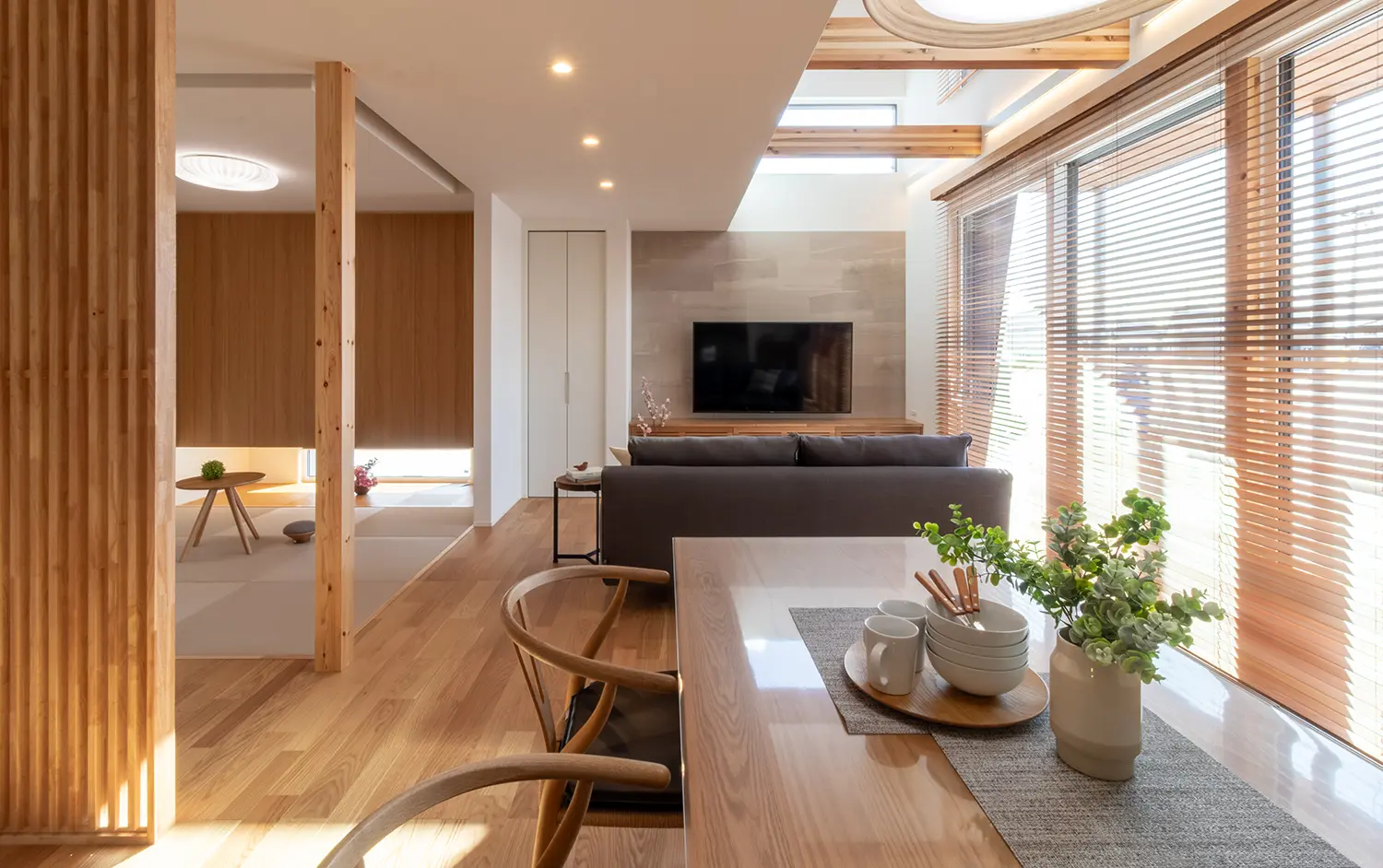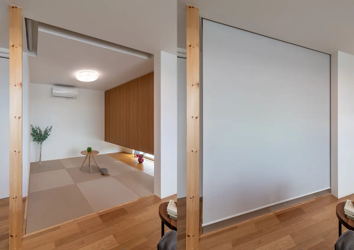 ふだんはオープンの1階和室は、目隠し格子や仕切れるスクリーンで、子どもの遊び場や来客用の宿泊スペースにもなります。