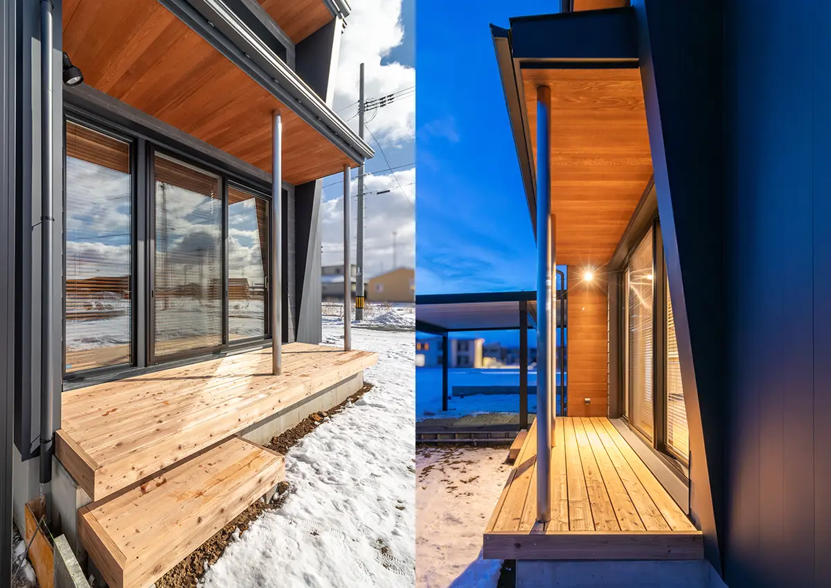 庇や袖壁で雨風を防ぐ、縁側のようなウッドデッキ。春になり植栽を植えれば、ここは子どもたちが走り回れる遊び場になります。