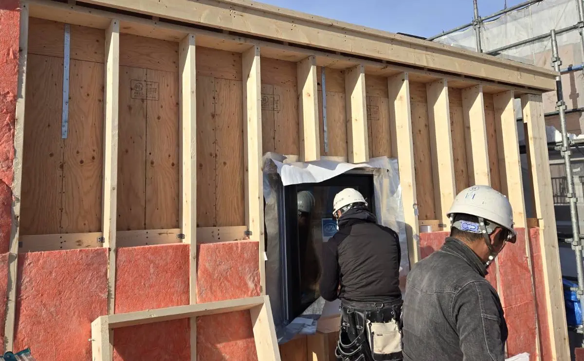 ↑ 300mm断熱は2段階で施工します。そのうち、外側の2/3の厚さの断熱材を施工している様子です。