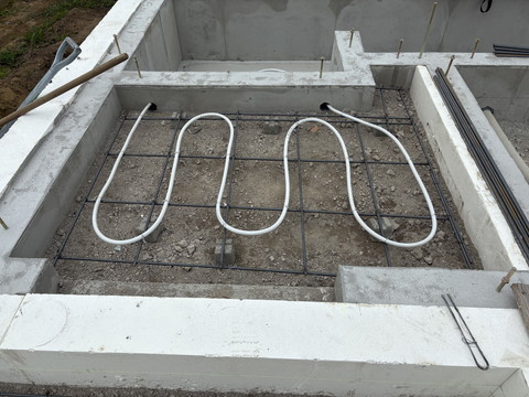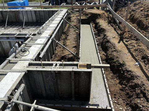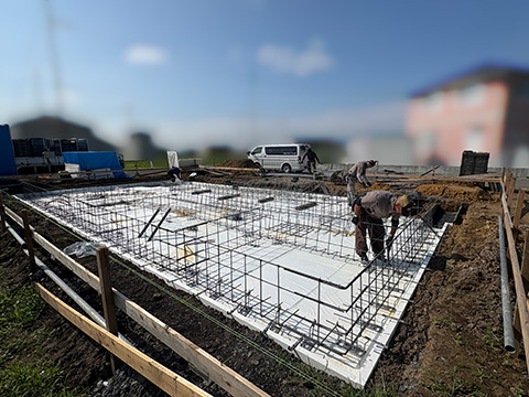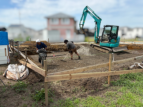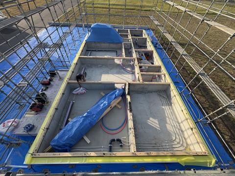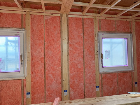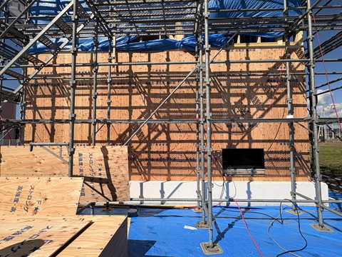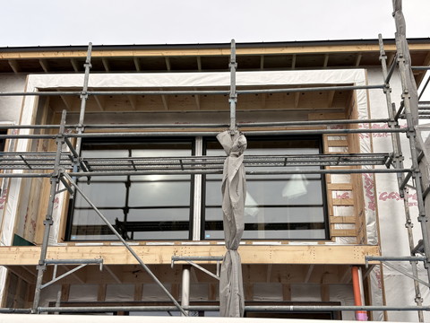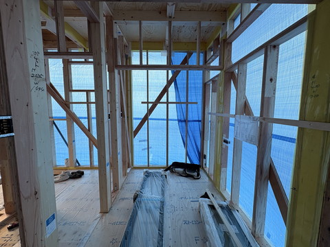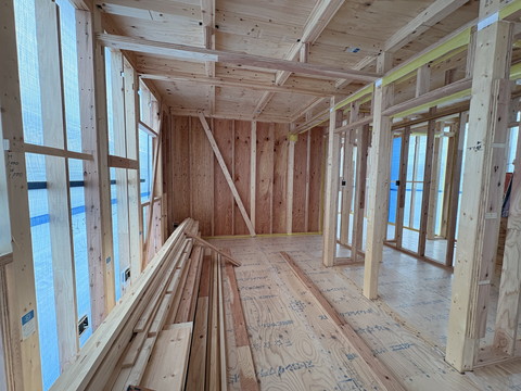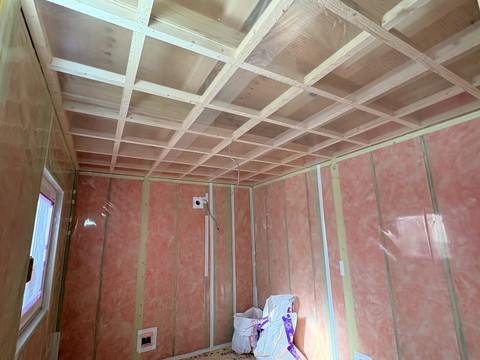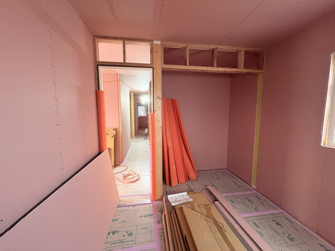 内部では石膏ボード張りと建具枠の取り付けが進んでいます。