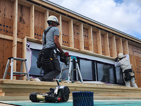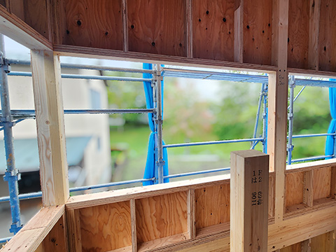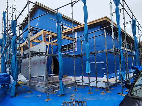 ↓は外部の付加断熱(ダブル断熱)のための断熱材を収める枠を作っている所です。
