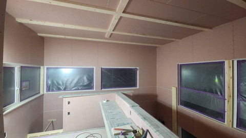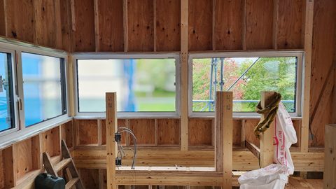 サッシが取り付けられた後は、内側からぷちぷちを貼って養生します。