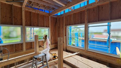 屋根を組み立てつつ、間柱(家を支える構造材ではなく、壁などを作り材料を留め付けるための細長い柱)入れも進めますよー。