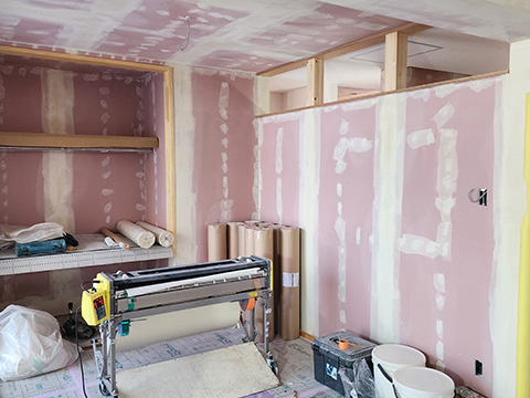 まずは石膏ボード同士の合わせ目や、ビスで固定した穴などを埋めてたいらにする、パテ処理からです。