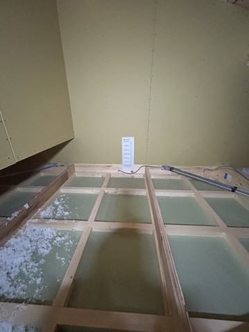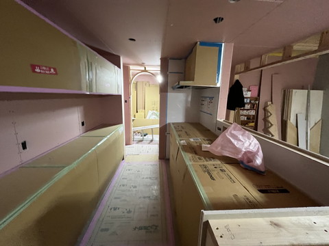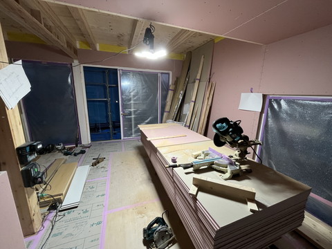 少し前になりますが、内部では石膏ボード張りと造作やドアの下地の準備をしていました。