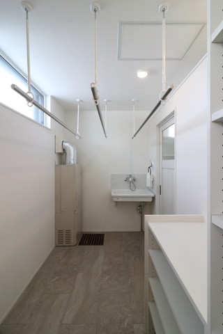 玄関土間からすぐに上がれる洗面室には、洗面とは別にスロップシンクを設けました。