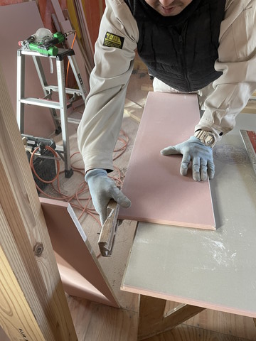 他にも大工さんが床材をカットしたり、仕上げに関わる部分の下準備を進めています。