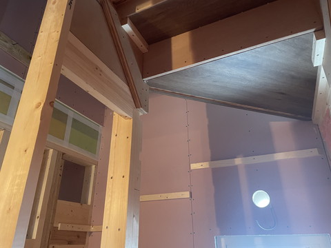 内部では大工さんが造作の下地を入れたり、石膏ボードを張り始めているところです。