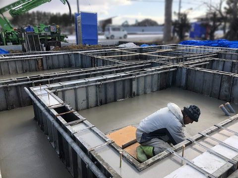 ↓は生コンクリートを流し込んだ後に、コテで表面を均しているところです。